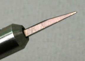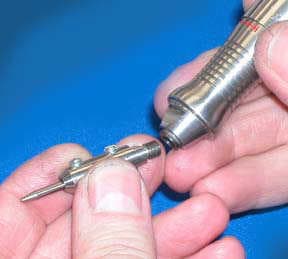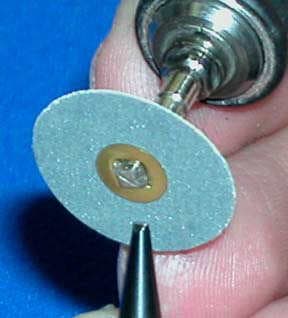 Three anvil points come with the kit and additional points can be purchased. Holman is shaping a point on one of the tips to perform the bezel setting. After polishing it, he inserts the point into the handpiece and does the bezel setting of the center diamond.