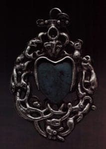 A silver pendant (Fig. 2) is probably one of the earliest surviving examples of Payne Bowles's jewelry. It was cast just as the Bronze age Celtic jewelry it recalls was cast and its design of animal faces overlooking a lapis lazuli heart is comparable to the ornamental patterns and animal faces that appear in Celtic and early Nordic Art. Moreover, it bears out the assessment Joseph Bowles made of his wife's work in a March 1910 letter to Frederic Allen Whiting, secretary of Boston's Society of Arts and Crafts, that it was "the barbaric sort of design in which she works most naturally."