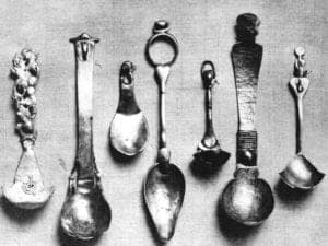 Through her relationship with Sir Caspar Purdon Clarke in New York, Payne Bowles had been introduced to J. Pierpont Morgan, president of the Metropolitan Museum of Art. Morgan, who was an avid collector of ancient jewelry and metalwares, doubtless had some understanding with Payne Bowles that motivated her to commence work for him, and following his death in March 1913, to continue this work for his estate and heirs. Although the Indianapolis press reported Payne Bowles's progress on this work, correspondence, invoices, or other confirming evidence for this commission are unknown. The gold and jewel-inlaid spoons for Morgan mentioned in the Indianapolis press between 1913 and 1920 presumably correspond to those illustrated in a 1924 profile on Payne Bowles in the International Studio, where they were captioned "Gold Spoons Made For J. Pierpont Morgan" (Fig. 3). Close study reveals that all but two of the spoons illustrated in the article survive in the Indianapolis Museum of Art's collection: but they are made of silver and although the ring terminal of one spoon (Fig. 3 bottom, fourth from left) may have originally held a jewel, none is embellished with jewels.