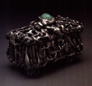 A lead box (Fig. 4, next page), one of the three surviving metal works signed by Payne Bowles, may be the box which earned her a bronze medal at the Panama-Pacific exhibition of 1915. Although its irregular surface of drips and blobs of molten lead is vaguely brain-like and recalls the zoomorphic creatures in Payne Bowles's earlier work, it is not dependent on representative images; subject matter has been dismissed. More abstract forms served her growing interest in exploring self-expression unrestricted by conventionalization and the constraints of traditional metalsmithing practices.