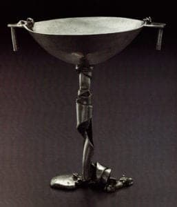 Just as Payne Bowles's earlier representative images evolved into abstraction, her functional forms, especially chalices, became sculptural. Chalice (Cover) is an astonishing example of the daring plastic experiments Payne Bowles brought to ritual vessels as complex free-standing forms. Unlike her earlier lead box (Fig. 4) where elements were added to surfaces of a preconceived form, here elements are used to generate the form itself. Combining silver alternately raised, cast, or as bent sheet, extruded wire, molten drips, snips and filings, form is made to interact with space, light, and shadow. But, despite the agitated quality of her forms, Payne Bowles always maintains a clear sense of the elements: sheet, rod, and wire retain their unique character and properties. In this and other chalices, traditionally solid elements such as handles and pedestals are punctured with voids or cavities. Elements wrap, encircle, frame, penetrate, and enclose space. Hollows become important with negative space active in the overall arrangement. Allowing no rest for the eye, the play of light and shadow, moving in, out, and over changes of shape and texture, is constantly agitated and evanescent, but nonetheless it resolves formal harmonies of balance and proportion. The arresting and numinous quality of these chalices is a result of this tension between resolved composition and fractured form and surface.