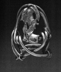 By the late 1910s Payne Bowles began to experiment aggressively with twisted wire. The interlacing seen in her earlier work breaks out into muscular, sinewy forms with a new, three dimensional interest in spatial perception and a wider range of interrelated fabrication processes. In rings twisted wire became a major part of her technique (Fig. 6); in one example a jewel was not so much part of a setting as it was "chained" in place. Wire intertwined to form hair pins is virtually alive with her creative energy. New materials were also of her exploration and in the early 1920s Payne Bowles was experimenting with "cupror" a new tarnish-resistant and ductile goldlike alloy introduced in 1910 that combined copper and nickel. Three rings survive from the seven Payne Bowles listed in a 1931 inventory as including cupra [sic], but it has not been possible to verify that these rings contain this alloy.