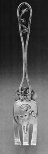 Most of the spoons published in the 1924 profile as having been made for Morgan were probably completed by 1915. In addition to Christian symbols (Fig. 3 top, far right) some of the spoons illustrate Payne Bowles's practice of invoking a mood of spirituality with avian and zoomorphic forms; one spoon has a handle that incorporates what appears to be a figure peering from a window topped by a rooster and a bowl joined to the handle by a head and arms. (Fig. 3 top, third from left). Silhouette is dominant in several spoons (Fig. 3 top, far left; bottom, second from right) and provides the background for an intricate overlay of soldered and fused elements that exhibit the complexity and mystery of the earlier cast zoomorphic motifs. The curls, beads, and snips on one spoon (Fig. 3 bottom, far left). Silhouette is dominant in several spoons (Fig. 3 top, far left; bottom, second from right) and provides the background for an intricate overlay of soldered and fused elements that exhibit the complexity and mystery of the earlier cast zoomorphic motifs. The curls, beads, and snips on one spoon (Fig. 3 bottom, far left), although built up out of molten globs and drips and fused snips and wires rather than being cast, correspond to Payne Bowles's earlier interlaced and vermicular work. However, where Payne Bowles previously constructed form out of interlaced vermiform elements, here she composed in a sequential, additive process that induced what she termed "the creative flow." In a manner typical of her later work, her fabrication methods are a visible part of her expression.