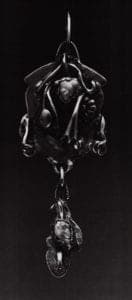 Payne Bowles was a scholar of all periods of art history and an especially avid observer of vanguard works at exhibitions she regularly attended in New York and other arts center. She practiced Dow's principle of abstraction intuitively, but her accretion approach may have also been encouraged by the collage art of Georges Braque and Pablo Picasso after 1912, and by the Americans Joseph Stella and Arthur Dove during the 1920s. One pendant (Fig. 8), for example, offers a double reading: as a face or as a composition of jeweler's bits and scraps. Her visceral engagement with her materials was a working approach that paralleled the vanguard "direct carving" sculptors Robert Laurent and William Zorach. Payne Bowles may have seen their decorative wood sculpture at the Art Institute of Chicago annual arts and crafts exhibition of 1924-25. These artists were interested in allowing the material itself to influence the form that took shape under their hands. Direct carving can be viewed as in the spirit of the handicraft revival eschewing the fabrication of designs by others or by machines. An illustration to an article in the Indianapolis Star for September 6, 1922, shows her playing the flame from a torch over her work. Soldering, fusing, and molten metal drips are well developed in Payne Bowles's work by 1920. For Payne Bowles her "creative flow" became the flow of molten metals with gravity and other forces of nature her ally.