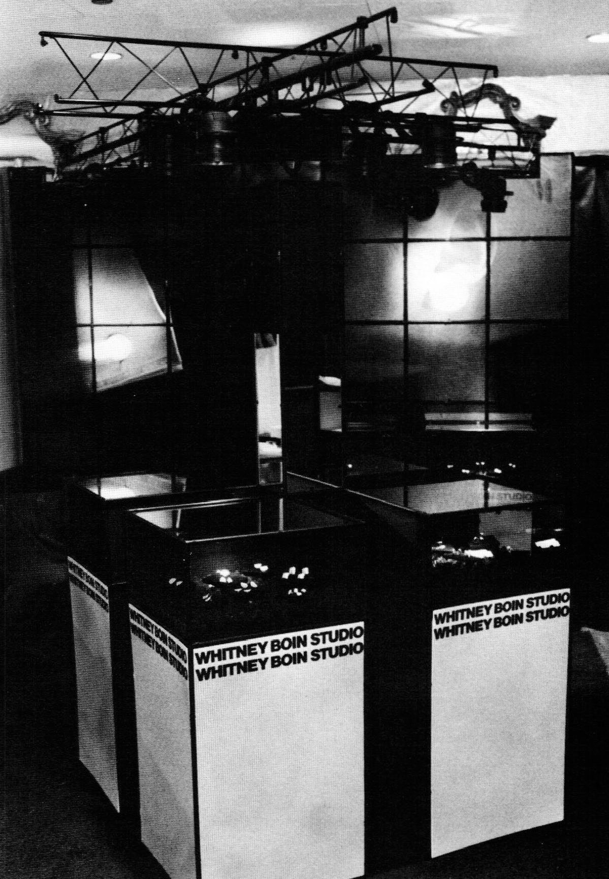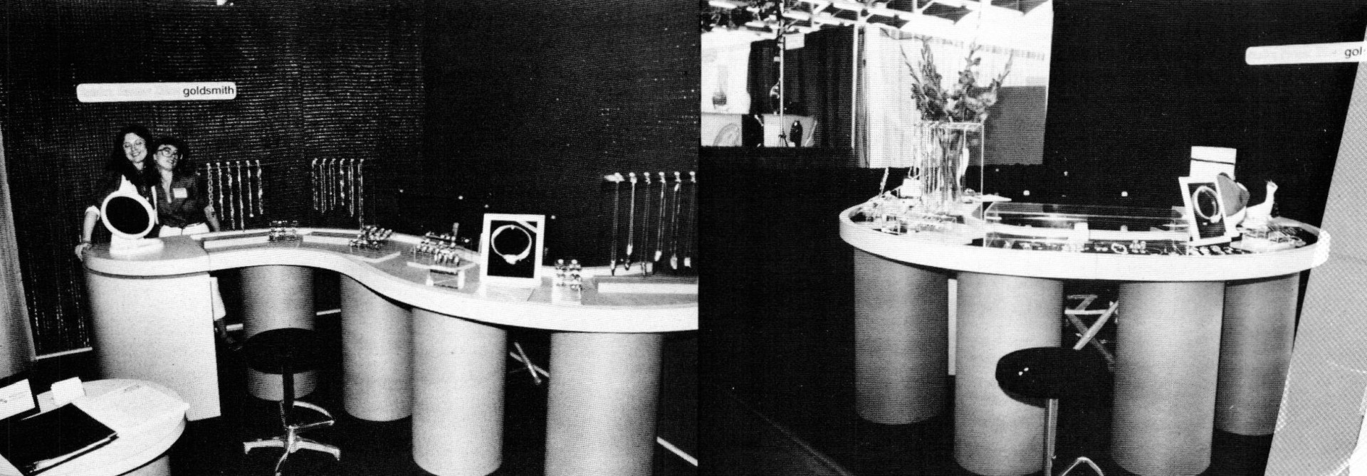 By altering a commercial Abstracta display unit, Boin created a back wall grid which holds an 8 x 10′ photographic mural of his trademark image of a man wearing his cufflinks and a woman's profile showing one of his earrings. A track lighting system, suspended from the back grid and a central mirrored column, dramatically spotlights the space. Floor cases are faced with enlarged photostats of Boin's graphics which prominently display his name and the pinstriping motif which reappears in his jewelry. "Even though the expense and time in creating this booth was phenomenal," Boin explains, "l felt it was well worth it. I knew I had this one chance to present myself to the trade in a professional manner, and I was unwilling to let it go by, or to gradually improve my booth over the next few years of doing the show." Like Reed, Boin feels confident that his investment will serve him well, and that it is flexible enough to change as his work develops. "The whole atmosphere of the booth could change with a different photographic mural and graphics," he adds.