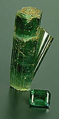 The rate of cooling must be very slow. When cooling is too fast, rocks with small crystal grains develop; granite is an example of very fined grained minerals that form together into a "rock". Granite is composed of potassium feldspars, quartz and other assorted minerals. Occasionally cooling of the submerged magma is very slow and large crystals develop. This coarse grained rock is called a pegmatite; like granite, it is composed of feldspars, quartz, but it has pockets where exotic minerals can form large perfect crystals. These are gemstones: tourmaline, topaz, beryls, spodumene are a few of the gem minerals that form in pegmatites. (Emerald in its rough state and as a faceted gemstone. Photo by ICA/Bart Curren)