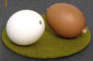 Salt and pepper shakers made of different eggs with fine silver hooks and lids by Micha Peteler