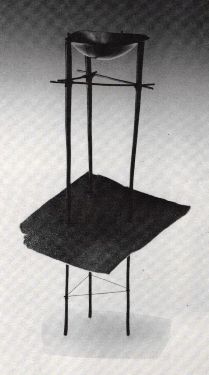 Rather than relate familiar imagery, the avant-garde is asking questions. The pieces in the exhibition that illustrated this attitude were those by Paulette Werger and Clair Sanford. Werger's Fishing Memories I forced the issue of meaning because technique and intrinsic material value were played down. Sticks lashed together hardly qualify for technical or material status. To appreciate the work one had to concentrate on composition and intent. To me the work conveyed the idea of a place you might find at the bend in the creek where debris is trapped and continues to float in the high water, until the creek recedes and it becomes still, entangled. Entwined in the piece were materials, such as a fishing float, leftovers of an old reel or pole and some willow twigs. That chaotic feeling was then contradicted by some simple lashing. This made the placement of the twig, fishing float and sticklike forms important because of the decisionmaking that allowed them to arrive there. The hand of man becomes obvious, through observation, expression and composition. Clair Sanford's Untitled Vessel also penetrated the area reserved for the "fine arts," where idea is the first concern. The piece had to be judged on its own merits, not on preconceived metalsmithing expectations. While trying to project a function for the piece, one had to find out what special use it has been designed for, if any. This work had the aura of being a special vessel for an unfamiliar ceremony. The use of a temporary material such as paper in conjunction with metal—a material deemed permanent—further suggested mystical powers or ritual importance.
