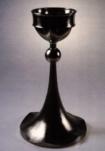Fenster particularly likes to do table pieces: cups, creamers, pitchers, salt and pepper containers and so on. For him, these pieces have to do with home and family and the rituals of sharing food together. In his own home his pieces are in daily use. Fenster's increasing interest in his Jewish heritage has clearly had a part to play in the design of his pieces, with their feeling of strength and solidity and mass. Many of his pieces are made as gifts for friends, and it is clear that he enjoys the act of giving. The table pieces, with their strongly functional lines, are among Fred Fenster's very nicest work. Good pieces made by the hands of a good man, for good people to use together at good times. Fenster also enjoys doing ceremonial pieces. As he puts it, "Here the problem is well defined, but there's a lot of freedom within that definition." In one series of wine cups designed for use in the Jewish ceremony of Kiddush, he has folded the base of the cup into a six-sided star, effectively uniting a powerful symbol of Jewishness with a functional piece.