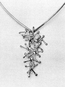 She has always liked making chains and designs them in endless variations. She believes in variations, for that, matter, and will almost automatically rework a design that pleases her from brooch to earrings to necklace to bracelet.