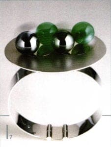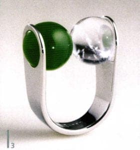 Ring, 1960. White gold, chrysoprase and rock crystal, stone balls interchangeable. Schmuckmuseum Pforzheim. The Worshipful Company of Goldsmiths, London. Museum für Angewandte Kunst, Cologne