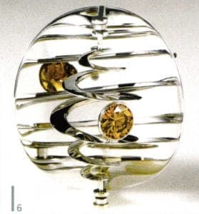 The stringent design by Friedrich Becker, which seems even to stretch to purism, are lent incredible charisma and liveliness through the skillful use of color and movement. The interaction between technical perfection, with the inclusion of physical principles, and artistic visions characterize the objects with the fourth dimension in jewelry and sculpture, created by Becker: movement.