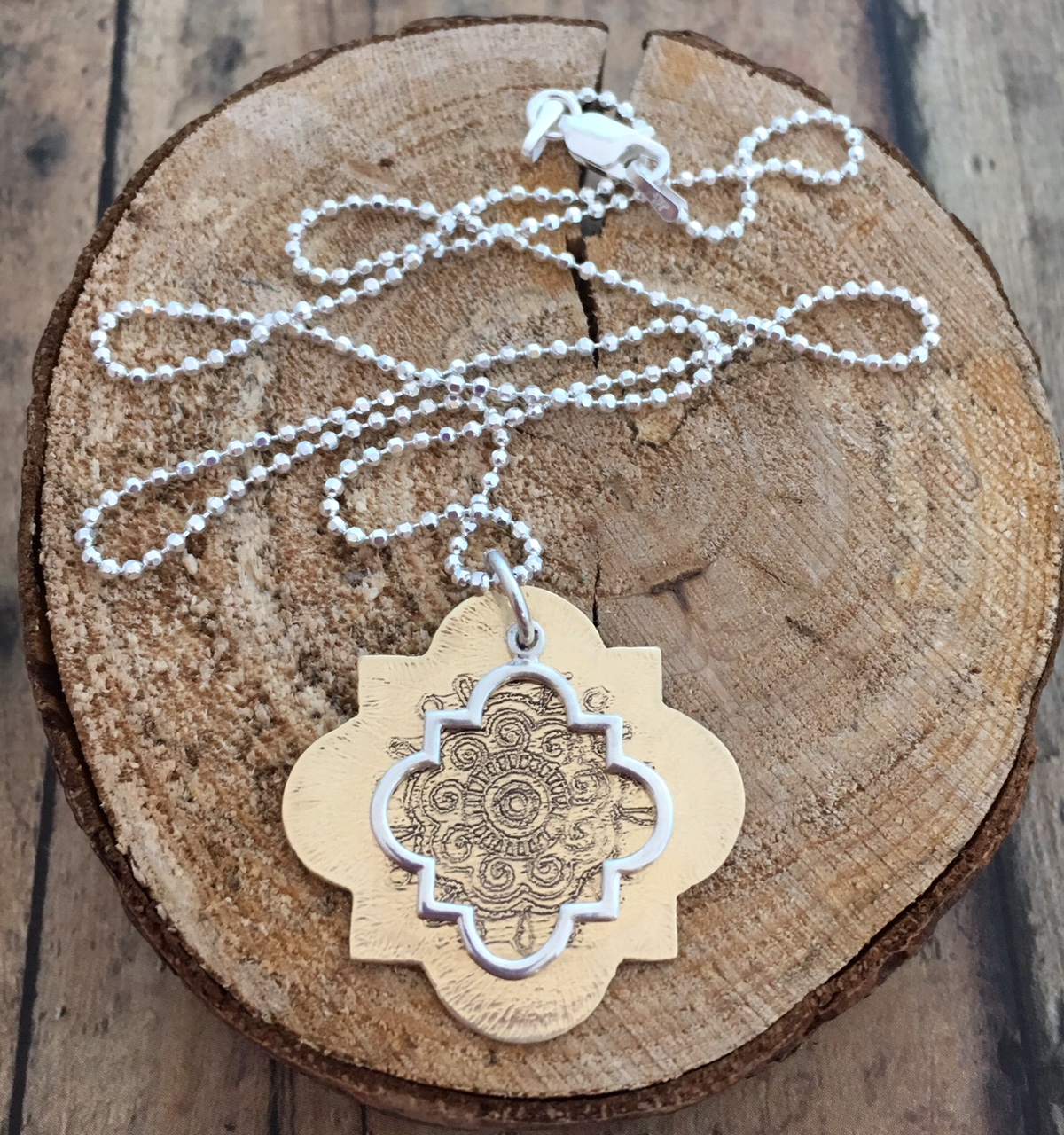 Rankin ordered the charm and played around with it, testing out different designs in her mind. Once she struck on one, she traced the outline of the charm on sheet metal and then sawed out the shape. She had ordered the same charm in a smaller size and placed it on top of the sawed out shape. "It looked pretty, but it needed something in the middle," she says. After tinkering with the pieces, she etched the center of the larger quatrefoil charm with a mandala design. "Adding the mandala design in the center helped bring it all together," she says.