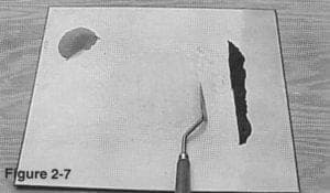- Rotate the mixing plate counter-clockwise 90°. Using the spatula, pull (spread or smear) the mixed powder down using several strokes, Figure 2-6. When it is all pulled down, scrape it into a row, as in Figure 2-7.
