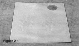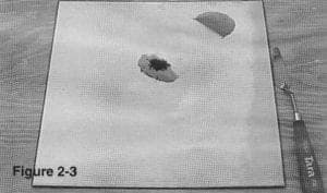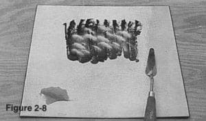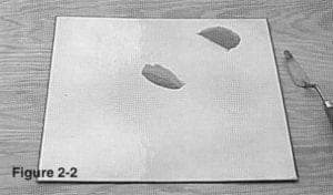 Figure 1-1 shows a piece of brown wrapping paper laying on a table with a small pile of 80 mesh transparent clear enamel, and a smaller amount of 80 mesh transparent dark blue in the center. These have been selected for teaching purposes. Normally, when mixing transparents, colors closer to the same strength would be selected.