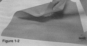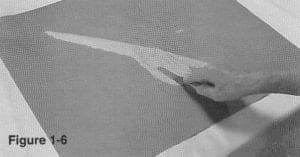 Figure 1-2 shows the upper right corner is being rolled toward the lower left corner. This is done in a way to cause the material to roll, not slide. Continue rolling the material toward the left hand, stop as the material approaches the edge of the paper. Take the lower left corner of the paper and roll the material to the upper right corner, Figure 1-3. Repeat this rolling from corner to corner several times, stopping the last roll with the material in the center of the paper, Figure 1-4. The center of the material looks well mixed, while the ends do not. Now, mix in the same manner, using the upper left and lower right corners, until you feel it is well mixed. Stop with the material in the center of the paper, as in Figure 1-5. The mix should appear the same throughout. Continue to mix, alternating the direction of rolling, until you feel confident the two colors are uniformly blended together. A further check is pulling a spatula through the material. as in Figure 1-6, and inspecting the distribution.