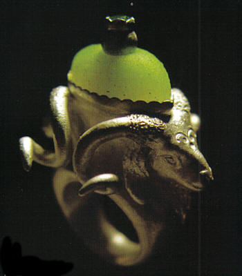 Sophia Wahl addresses inner longings, as her jewelry focuses on comfort and a sense of security. The designer believes that people find comfort in beauty, color, genuineness and honesty, while a sense of security is found in things that accompany us and come back reliably. Her mildly ironic collection "Almauftrieb" combines colorfulness, joy and traditional values to mirror the Almauftrieb herding festival to celebrate the perennial return of spring. The silver ram and the colorful, plastic cushions and colored gemstones are suitable symbols of this.