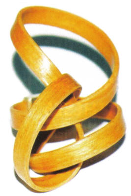 The Danish born artist, Mette T. Jensen, presents an extremely impressive set of work that is characterized by its lightness and buoyancy, consisting of jewelry made of beech and cherry wood. Flowing forms inspired from bent wood in furniture and ships were the basis for playing with curves that change directions, define shapes and suggest forms in an attempt to make sculptural jewelry. Drawing on this inspiration, the main material used is wood. Its molding capacity is emphasized by a combination with silver.