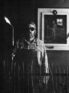 In contrast to the more sculpturally oriented constructions, Blue Gate (1984) and his chair, Restored, Rennovated, Repaired (1984) are functionally ornamental constructions resonant with multiple associations. Blue Gate for example, explores the functional and the useless simultaneously by allowing one to enter the visual field of activity without recognizing its utility. One realizes immediately by zeroing in on the illusionistic visual mix of objects—tree stump, birdhouse, canoe, rose, barbed wire, repaired and nailed broken pieces of wooden slats—that Griffin is fascinated with using representational elements as a form of ornamentation. Their juxtaposition bypasses the abstracted and formal nature of ornamentation that is most often found in contemporary ornamental ironwork. Griffin was familiar with Saarinen's gates at Cranbrook, the gates of Albert Paley and was most likely conscious of gates and their relationship to the history of the decorative arts.