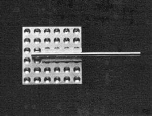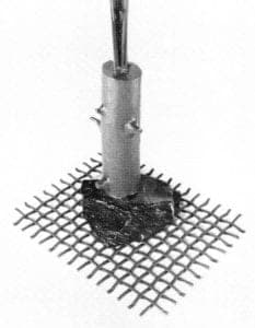 In July of 1979, Griffin attended the Platinum Workshop in San Diego. He immediately began to pick up and use the residuals left over from his own and other works being processed at the workshop and use them in his momentary pins. For example, he would start with a square piece of sandpaper to function as a pin and use platinum wire as a tool to scratch on its surface. Or he would attach to the pin a filing or piece of wire that had been displaced from the material being processed. Platinum was no longer of interest to Griffin in the traditional sense of its preciousness or as the material to be worked on. There is also an element of irony in these pins in relation to normal metalsmithing practices. One even senses a metaphorical conceit operating in the sandpaper momentary pins by the exaggeration and extension of their metallic references. For example, the only connection sandpaper has to metal as a material is the metallic oxide on its surface, or as a processing, material in one of the phases of making a finished object. In effect, Griffin elevated an abrasive material, which is usually disposed of after being used to process other materials, to a legitimate material in its own right. Preciousness, uniqueness and permanence were theoretically upended, giving the pins a potentially ephemeral and nonprecious character. Furthermore, the random stacking of the pins and their display in a meshlike industrial basket, as if thrown away, reinforced their transitory nature. In discussing the concepts underlying these pins in the context of ornamentation, Griffin compares them to the "tradition of wearing l flower on a lapel." Once a pin serves its function for a specific occasion or begins to wear out, one can just throw it away, since it can be cheaply replaced.