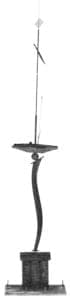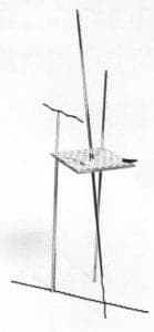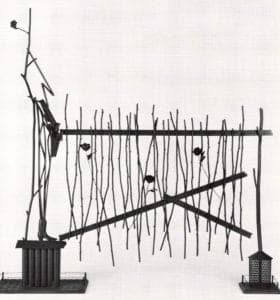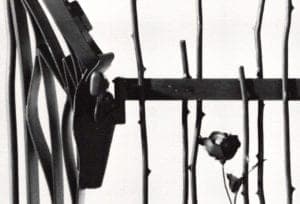 In looking at the suggestive formal and conceptual relationships used in this gate. Griffin conjures up a whole series of references. The thorns of a rose's stem are contrasted to the barbed wire (the natural versus the manmade), or the idea of a barbed-wire fence being used as a barrier or enclosure to keep animals penned in, is subtly opposed to the notion of a gate with its allusions to entering and exiting. The gate, when viewed more closely, is in a state of disrepair and is temporarily held together. This is an example of what Griffin calls "design by necessary" (e.g., using a coathanger to hold up a muffler until one got to Midas).