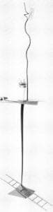 Construction 81-4 (1981, steel, plywood, glass and paint) is indicative of the germinal stage in his current direction involving an emotional symbolism associated with sentiment, memory, landscape and an increasing interest in the decorative arts. Formal and "material" references, including filings, disposable cardboard cups and the geometric mesh screen had affinities with his previous constructivist and entropically inclined formats. Connections to the history of furniture could be sensed in the attenuated cabriole leg tapering upwards from the tetrahedral base as well as the tabletop configuration. For the first time in his art personal symbols and representational imagery were incorporated in his constructions: the Pueblo Indian ladder, a crucifix shape and a plastic rose.
