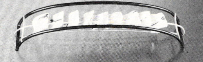 The show's presentation was also notable. While Saunder's work obviously does not suffer from a lack of ideas, here all pieces were variations on one theme: black geometry with interior panels of goldwork. Whether this was the gallery's or the artist's decision, it was right. The Helen Drutt Gallery exhibits jewelry in a banque of brushed steel and gray velvet wall cases which accommodate large or dramatic pieces, showing them to great advantage. Small or delicate work can sometimes seem overwhelmed in them.