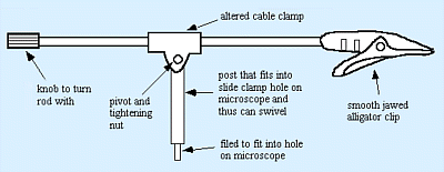 Here is a photograph of the system in place. Note the polarizing filter attached to the objective above the alligator clip stone holder.