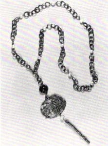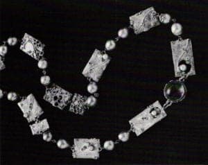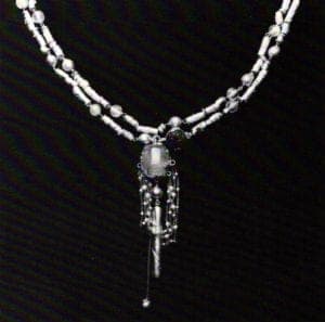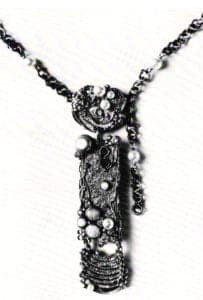 It was while teaching at Hornsey that her jewelry began to move away from Scandinavian design. Quite by chance, she discovered fusing, which radically changed her work. "One day in 1963 my work was going very poorly and I was depressed," she says. "I was mucking about with pieces on the bench - strands of silver and rectangles which I twisted up into a bead. Then I fused bits of all different sizes onto it. I thought it was awful. But I continued to work and finally threaded the beads up and thought, you can't possibly work by melting things together. But today I still use fused beads, only now they're more developed and refined." For a number of years fusing was an experimental process for Gerda Flöckinger . "I didn't know what the metal would do," she says. "I made a terrific load of mistakes. I didn't have sufficient control over the process. In 1974, I started a necklace for the Royal Scottish Museum. I made two disc pieces with diamonds, pearls and opals, fused silver details and gold dust. But then, the next discs I made failed. I couldn't repeat the process and didn't know why. So I made a completely different necklace for the museum in three weeks. I wasn't until the mid 70s that I actually figured out how to control fusion. And I realized that it was quite easy."