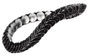 The work of designer Hermann Schafran, who received his advanced training in Pforzheim, epitomizes an obsession with precision. Schafran repeatedly tackles the most difficult designs and carries them off with the elegance of genius. His undulating disc necklace is a masterpiece of beauty achieved through precision.