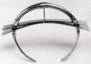 The traveling exhibition would not be complete without including Klaus Ullrich who has influenced this generation of German jewelry designers as much as any other person. As professor of the acclaimed Pforzheim School of jewelry for a quarter century, Ullrich has continuously won awards for his innovative designs. Certified as a master goldsmith and silversmith, Ullrich demonstrates in his work his fascination with visual perception and tension. He gains subtle control of the viewer's eye, as in his Leaf Spring bracelet, which focuses on a taut gold thread supporting two cool stainless steel bars.