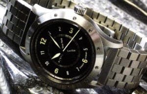 The automatic watch CM03 by Temption with second time zone on a 24 h basis. Nice extra: an onyx sparkles on the crown