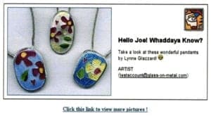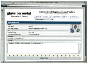 Glass on Metal Magazine is excited to announce the development of an online enamel art gallery, located on the internet at http://www.glass-onmetal. com./gallery/. Our online gallery offers enamelists the opportunity to display their work in enamel in a Salon-type area of the Glass on Metal website, and also work in any medium in their own personal gallery section.