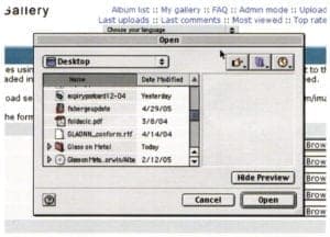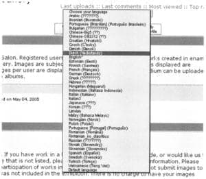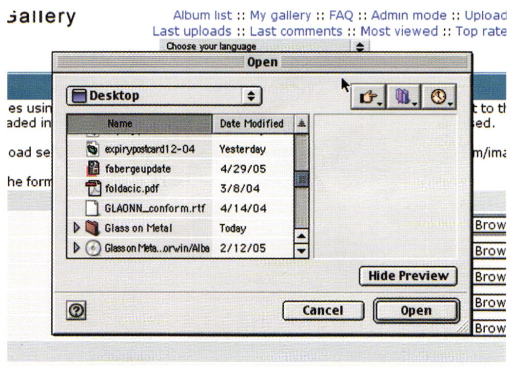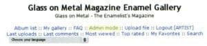 Point your web browser to http://www.glass-onmetal. com/gallery/. On this page, you will find a brief description of the gallery, a link to the gallery site (this link will open another browser window; the gallery is hosted on a separate web site), a link to the gallery FAQ (Frequently Asked Questions), and links to free image optimizing websites. You will want to start by visiting these links and preparing your images for display on the web. Once you click the link to the gallery, you will see a drop down menu box below the main navigation bar, prompting you to choose your language. Thirty-seven language modules have been installed. Scroll down and to select your language choice. Language modules support navigation features only; category, album and image descriptions will remain in the language posted by individual users.