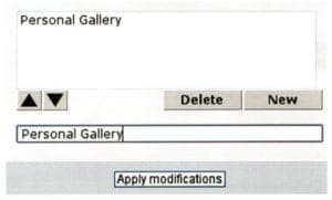 A window will open containing an album creation box. If you have existing albums, they will be listed here; if not, the box will be empty. Click the 'New' button below, and an album titled 'New Album' will appear. Click this album title, and change the title of the album in the text box below (see Figure 7). Once you have made your changes, click the 'Apply Modifications' button. If you have created more than one album, you can also change the order in which your albums appear, or delete unwanted albums.