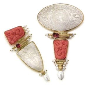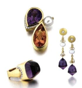 From her self-designed home, which she describes as "an oversized piece of jewelry which functions as a house", she envisions and sketches jeweled creations both whimsical and royal. With the help of her loyal team of master craftsmen, she performs the alchemy of turning her dreams into 18-24 karat gold. For Carolyn Tyler, collecting gemstones is a passion. She favors using "phenomenal" gems, ancient coins and South Sea pearls in her one-of-a-kind creations. Nature, mythology, art, music, and dance inspire the designs. Using goldsmith techniques from antiquity such as granulation, filigree, and repousse, she creates pieces that are evocative of the fabled buried treasures of golden ages past.