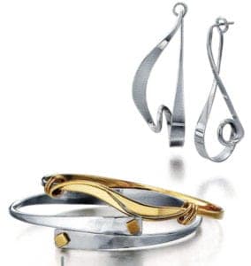 Her jewelry pieces are like kinetic jewelry sculptures. With the movable elements she aims to breathe life into the pieces. Rebecca Overmann studied at the Savannah College of Art & Design and has been a freelance jewelry designer for 15 years. Her hand wrought pieces in gold, oxidized silver enamel and diamonds stand out with their pure, flowing forms, their timelessness radiating an emotional, human warmth. Her works are somewhat reminiscent of Scandinavian ideas. Here pieces can be found in selected galleries and jewelry stores in the USA. Each piece is created in her studio in San Francisco and crafted by hand.