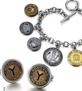 Old typewriter keys, coins in long-forgotten currencies or tokens for the New York Metro: they all find a second life as individual jewelry items at the firm Tokens & Coins. The founder of the company, Ward Wallau, came up with the idea in 1980 when the New York Transit Authority fundamentally altered the design of the tokens with the large Y, which had been unchanged since 1953. He persisted for over 11 years before acquiring the exclusive license to use the old tokens for jewelry purposes. A short time later, he pulled off a similar coup in Chicago. For almost five years now, the tokens in New York have been consigned wholly to history. Removed from circulation for cost reasons, they have been replaced with normal tickets. The New York-based company has also processed former European currencies such as the Deutschmark into jewelry items with a nostalgic charm.