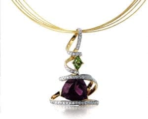 Hubert Gesser, founder of the company and principal in charge of design along with his wife Susan Gesser, believes that any great piece of jewelry starts with a brilliant and beautiful center stone. "The cost of the gem is not the issue. If a stone displays a vivid hue and radiates beauty because of a marvelous cut, it will always be desirable. However some so-called 'precious gems' may be expensive yet dull and unattractive," Hubert says. Hubert specializes in fine yet fun custom jewelry. Well known for their large and unique styles, the company has always stayed with unusual and bright center stones. Hubert Gem have their own in-house lapidary. By maintaining near ideal proportions in their cuts, the gems lose more weight from their rough form and thus yields are lower - but the finished pieces more attractive. Hubert also uses above average diamonds in high colors, and high clarities.