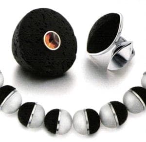 The Swiss artists Andréia Vaz Lino and Roberto Sutter founded Horizonte with the arm of producing unique jewelry. The result is wonderful gemstone and seashell and mother of pearl chains. The stone surfaces are often left rough and unpolished, or assembled, roughly-worked, into artistic necklaces. The Canary Island Collection is based on black, porous lava, such as that often to be found on the islands off the coast of western Africa. The combination of jet-black semi-circles and silver balls creates a composition of fantastic contrast.