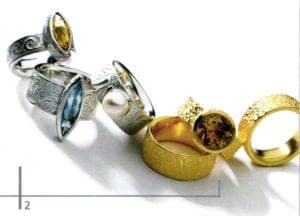 - Doris Gassmann, rings from the "Artemis" series. Silver, gold-plated detailing, aquamarine, citrine, freshwater pearls