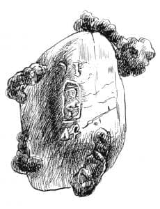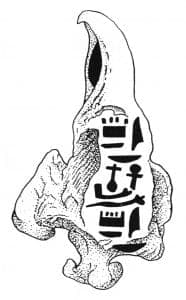Adjacent to the nugget pendant from Meroe West 859 was an unworked lump of amazonite which as bored for suspension. This material, durable and no doubt highly valued for its color, also had divine and royal connections. An earlier specimen inscribed for King Taharka (690-664 B.C.) in the Brooklyn Museum uses to advantage the edge of the crystal for the funerary text (Fig. 4). As with the first nugget jewel, this caged royal pendant reinforces the connection between an indigenous natural form with position, power, and religion.