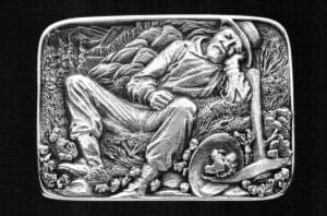 The romantic image of the gold miner remains a part of our imagination. Nineteenth century mining jewelry is avidly collected and continues to be a source of inspiration for contemporary craftsmen. Such as the nugget encrusted sterling silver belt buckle designed by the Canadian sculptor Thomas R. McPhee (Fig. 8). The idea for the composition derives from a black and white photograph of the Klondike region by E.A. Hegg (1898) entitled, The Exhausted Stampeder. Surface decoration using small nuggets and cast nugget look-alike continue to be made and purchased in those areas once known for their mines.