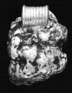 Technically, nuggets can be easily joined and made into chains, bracelets and pendants by adding small soldered loops. Often the final product would take the form of a watch fob or stickpin, both utilitarian items. In fact, many watch fobs have since been converted into more marketable items such as necklaces. Sometimes, however, the miner would request that nuggets be fashioned into a piece of jewelry that would then be given to a family member or loved one. The Oakland County Museum holds in its collection a threestrand necklace which contains fifty gold nuggets. Fortunately the provenance for this piece is known - a share owner of the Argonaut Mining Company presented it to his daughter around 1900 - a valuable token of his pride and affection.