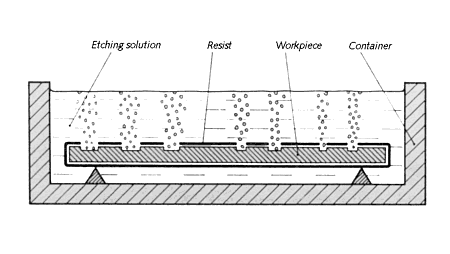 As etching continues, the metal forms a layer of bubbles that will limit the ability of fresh acid to reach the surface of the metal. Brush the bubbles away every few minutes with a goose feather, the best tool for the job.