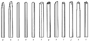 | Figure 10.36 Various punch forms and sharp punches. a) and b) lining tools c to e) modeling punches, f) planishing punch, g) matting punch, h) setting punch, i) hollow or ring punch, j) jig punch, k and l) texturing or design punches. |
