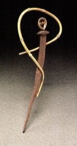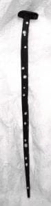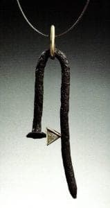 Such knowledge informs Flynn's treatment of these slender rods of iron. In fact, we may be tempted to overlook the fact that the nail is a nail, because it has been transformed into an object of ordinary beauty, transformed from object to ornament. Flynn's jewelry is both about the nail and about jewelry, in the way Abstract Expressionism is about paint. A hand-forged nail is layered with meaning from a sensory-rich past in which the air sang with the blows of the blacksmith's hammer. Flynn eliminates the voyeurism of found objects by forging his own nails. He can "hollow them all out and solder in platinum tubes….I like that sort of trickster-fox sensibility, sort of upping the ante….I like the idea that what they're really all about is not so evident up front."