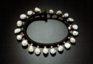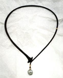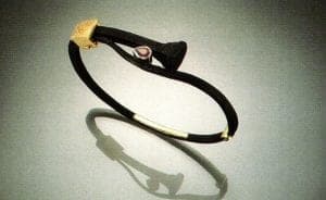 Flynn uses the nail to continue his exploration of a visual dialectic that has intrigued him for years, keeping the implied tension using the simplest of forms, the line. Over time, each jewelry form - brooch, bracelet, neckpiece - has grown more confident than its predecessors. Like a late Beethoven quartet, they seem distilled and purified to the very nature of their form. The bracelets in particular have come into their maturity after years of experimentation. Thinner, lighter, more spare, and more elegant, they are now more than ever about the line. Even more than the nail/diamond/gold brooches of a few years back, they represent the best of the many ideas Flynn has confronted with his materials. There's temporality in the eternal gold and transitory iron; gender, even class, are represented in the resolutely blue-collar iron and elite, noble gold. The mythology of the diamond itself, the perfect crystal, holds that it can "cure disease, render poisons impotent…make one invisible, and grant men good luck with women." Naturally occurring South Sea pearls recall, as well, our marine origins and salty, fishy sexuality. Flynn's choices seem single-handedly to prove "what metalworkers believe material to be influences what they make." Each fluid back line ends in a different clasp articulated by a gold hinge. A nail end slips past the head to snap into a box clasp, or snakes around a ruby tear drop, to slide into its gold housing. One opens like a pirate's chest; another tapered end snaps into a volumetric fabricated leaf that swivels to accommodate it. A square ruby slots into an opening in a hinged clasp adorned with telltale crosshatched file marks, the entire confection so smooth it will never snag the hairs on your wrist.