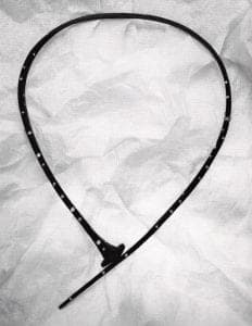 Equally wearable is a necklace forged of a single nail; direct and sensual, it wraps right around the head and lays lightly on the collarbone. Even a massive hollow nail brooch inlaid with forty-three diamonds miraculously curves along its vertical axis to accommodate the wearer's body. Nearly invisible mechanisms underscore a sympathetic physicality, for example, the way the springy metal snaps onto the clasp or pops out of its tubular closure. Seemingly controlled, the gestural line threatens to spring open and release its energy. Paradoxes of modern life are expressed in pairing iron, which only seems permanent and unyielding, with truly enduring gold and diamonds. These elements (Au, Fe, C) are gouged out of the same earth we walk and to which we return.