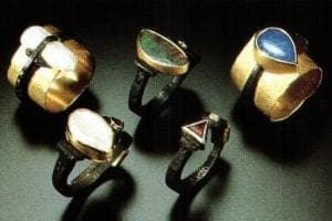 Flynn's achievement of intimacy and technical mastery rests on a foundation of thousands of years of European goldsmithing. "As a forger of [metals]…and as a powerful, creative agent of change, the smith…often appears as a ruler over fire, as a healer of diseases and as a rainmaker…" Egyptian reliefs from the First Dynasty show smiths at work. Gold is mentioned in the very first chapter of Genesis, chain-making in Exodus. The 12th century monk Theophilus devoted seventy-nine chapters to the art of the goldsmith in his description of the arts of his time. "The goldsmith was required to be a modeler, sculptor, smelter, enameller, jewel-mounter and inlay-worker." As if personally bearing the weight of 3,000 years of tradition, Flynn was slow to accept the mantle of goldsmith for himself. Asked to name his heroes, he chooses the Italian master Mario Pinton.